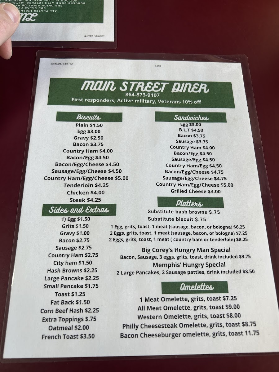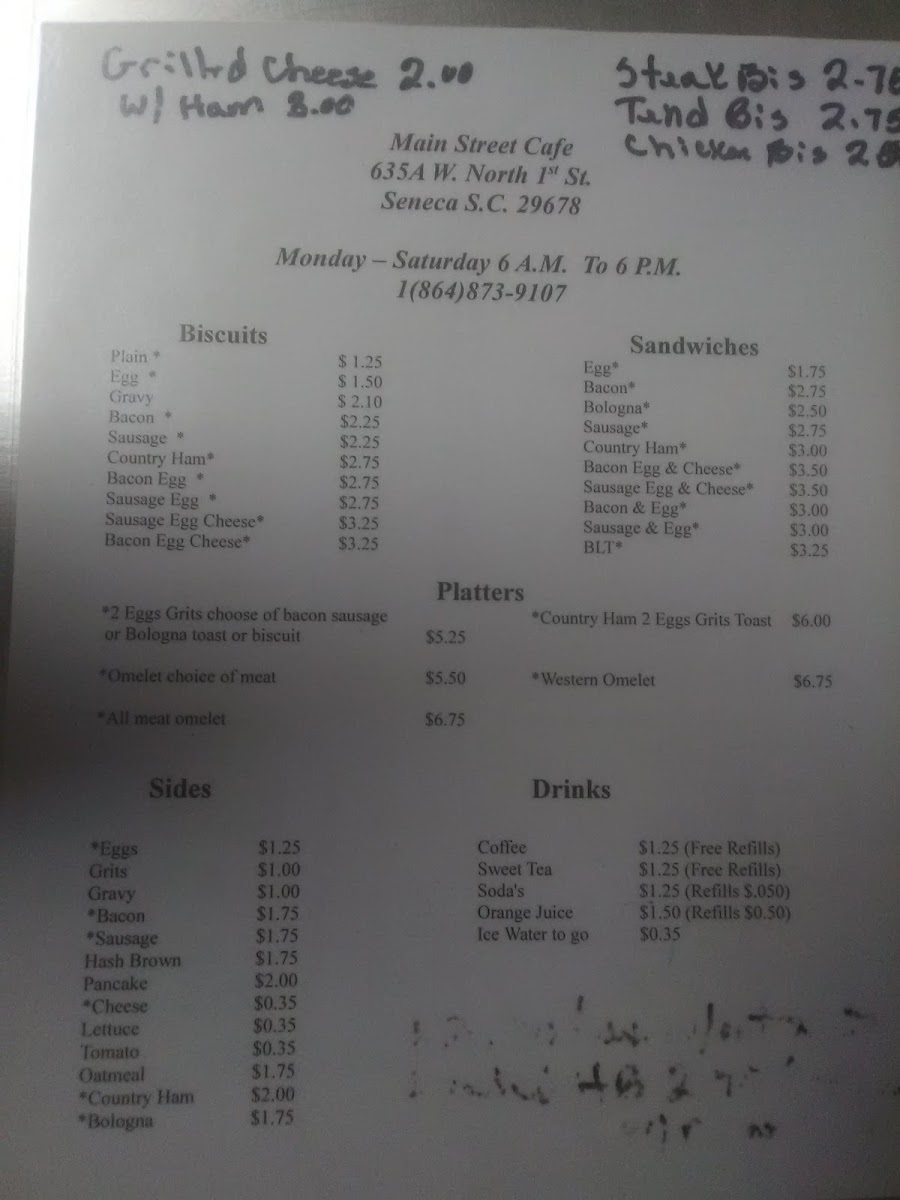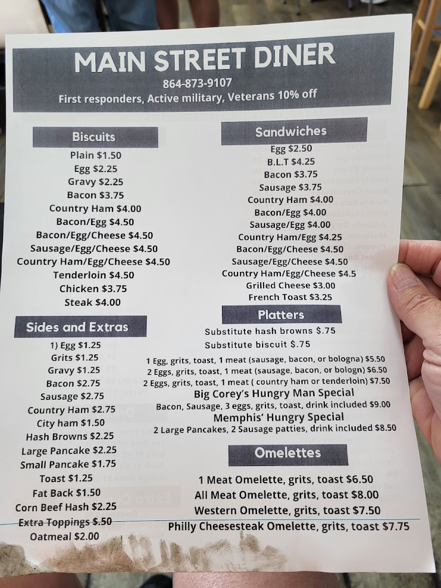 Wrapping up my look at the menu at Main Street Diner (635 W North 1st St, Seneca), it’s clear this is the kind of no-fuss spot that leans into classic comfort food and satisfying portions. If you’re craving straightforward burgers, the “Single” lineup covers all the staples-from Hamburger and Cheeseburger to heartier picks like Double Burger, Double Cheeseburger, and Bacon Cheeseburger-with plenty of options to keep it familiar but never boring. The sides keep things equally dependable: Fries, Chili Cheese Fries, Onion Rings, Tater Tots, and Slaw are exactly what you want alongside a diner-style meal, while simple drinks like Coffee, Tea, and Soda complete the easygoing vibe. Breakfast looks like a major strength here, especially with biscuits such as Egg, Gravy, Bacon, Sausage, and Country Ham, plus sandwiches like Bacon, Bologna, Sausage, Country Ham, and the classic Bacon Egg & Cheese. For bigger morning appetites, the platters-1 Egg, Grits, Toast, 1 Meat, 2 Eggs, Grits, Toast, 1 Meat, Big Corey’s Hungry Man Special, and Memphis’ Hungry Special-offer that full “plate-loaded” diner experience. Omelette fans have a lot to work with too, including 1 Meat Omelette, Grits, Toast, All Meat Omelette, Grits, Toast, Western Omelette, Grits, Toast, Philly Cheesesteak Omelette, Grits, Toast, and even a fun twist with Bacon Cheeseburger Omelette, Grits, Toast. And if you want something outside the breakfast-and-burgers lane, there are comfort-food anchors like Patty Melt With Hash Browns Or Fries, Hamburger Steak Fries + Slaw, and 2 Hot Dogs, Fries And Slaw, plus a lighter option in Large Grilled Chicken Salad-and a simple sweet note with 1 Small Pancake, 2 Eggs, 1 Meat. Overall, the menu reads like a greatest-hits collection of diner favorites: familiar, filling, and built for people who want classic flavors done without overcomplicating anything.